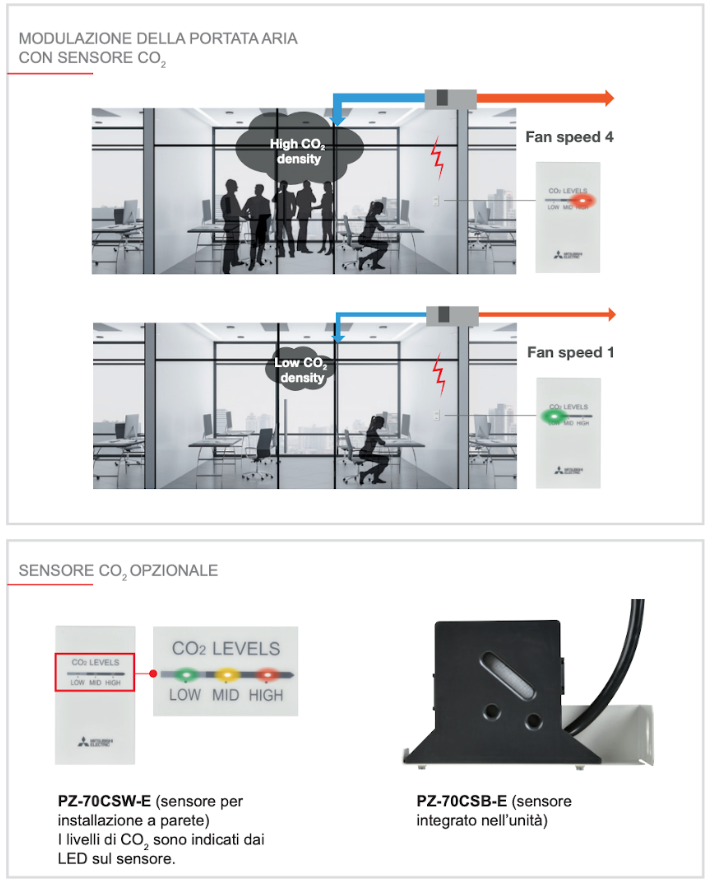 Un sensore CO2 connesso direttamente all’unità permette di ottimizzare la portata dell’aria in funzione del livello di anidride carbonica rilevata negli ambienti migliorando l’efficienza di scambio termico e contribuendo al risparmio energetico.