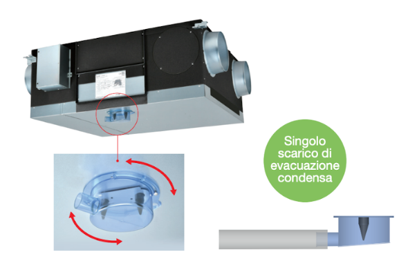 Scarico condensa singoloL’unità LGH-RVS è dotata di uno speciale scarico condensa che permette la connessione di una singola tubazione di evacuazione condensa.